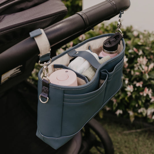 Oioi Vegan Leather Stroller Organiser/Pram Caddy - Stone Blue