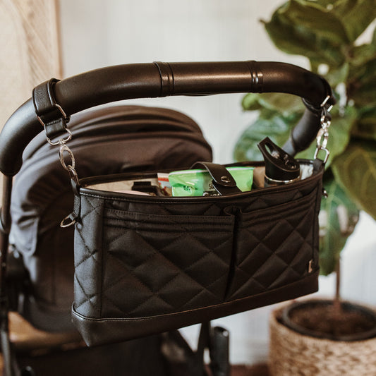 Oioi Vegan Leather Stroller Organiser/Pram Caddy - Black Quilt