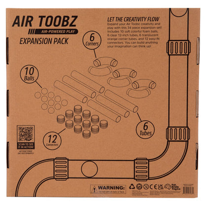 This expansion pack comes with enough tubes and connectors to double the length of your Air Toobz build, plus 10 extra balls to keep the fun flowing. Explore and experiment even more endlessly with the Air Toobz Expansion Pack!