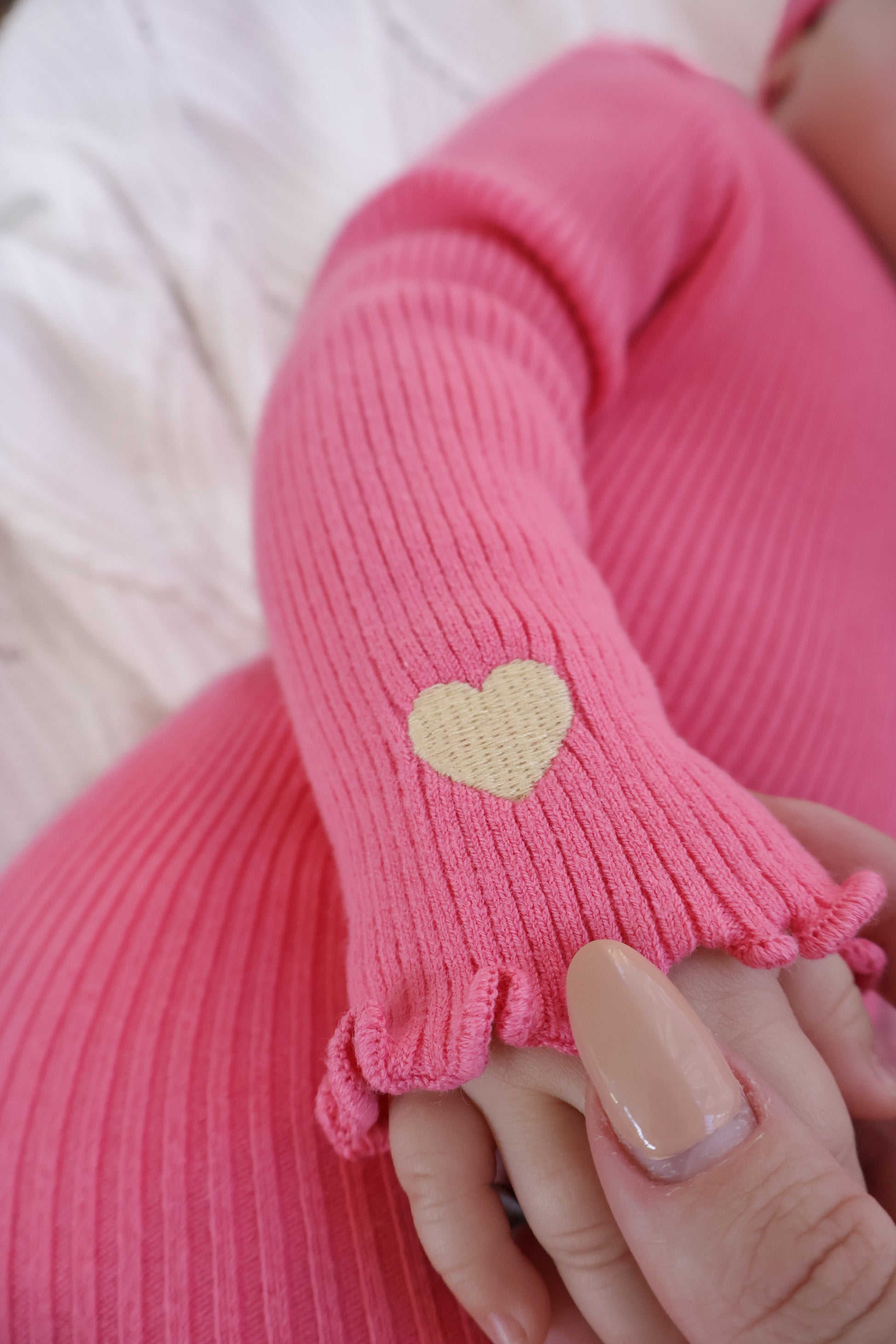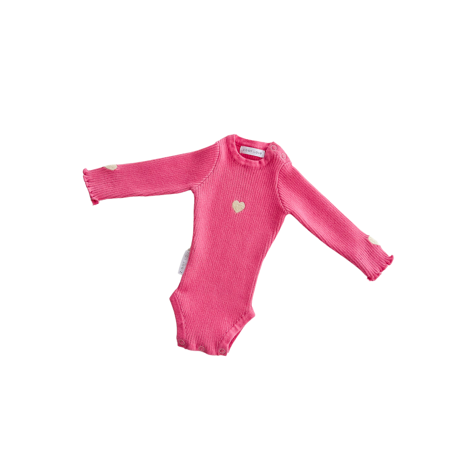 Ribbed, long sleeve bodysuit in our Raspberry colour, featuring an embroidered Heart on the chest and on each frill sleeve cuff. Functional press snaps at crotch for easy nappy changes and press snaps on shoulder for easy on/off. Match with items from our Raspberry + Marlow Collections.