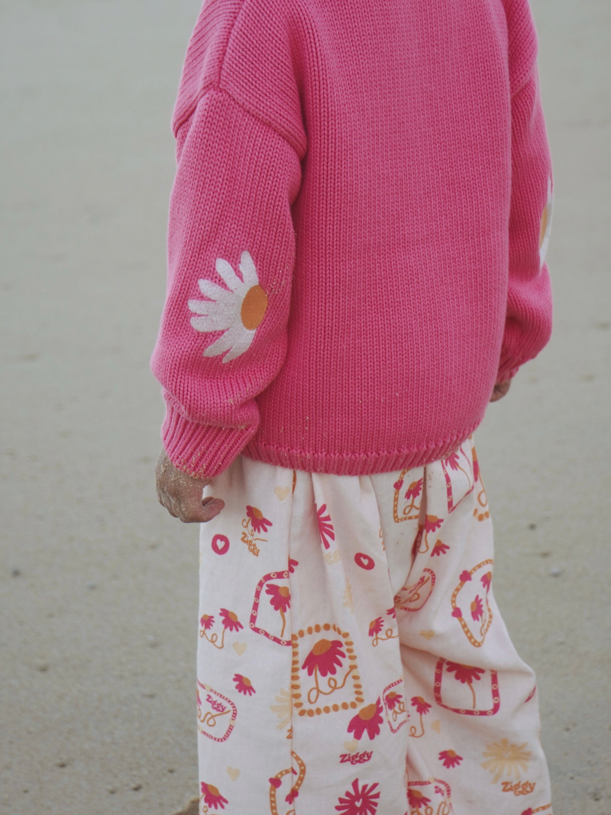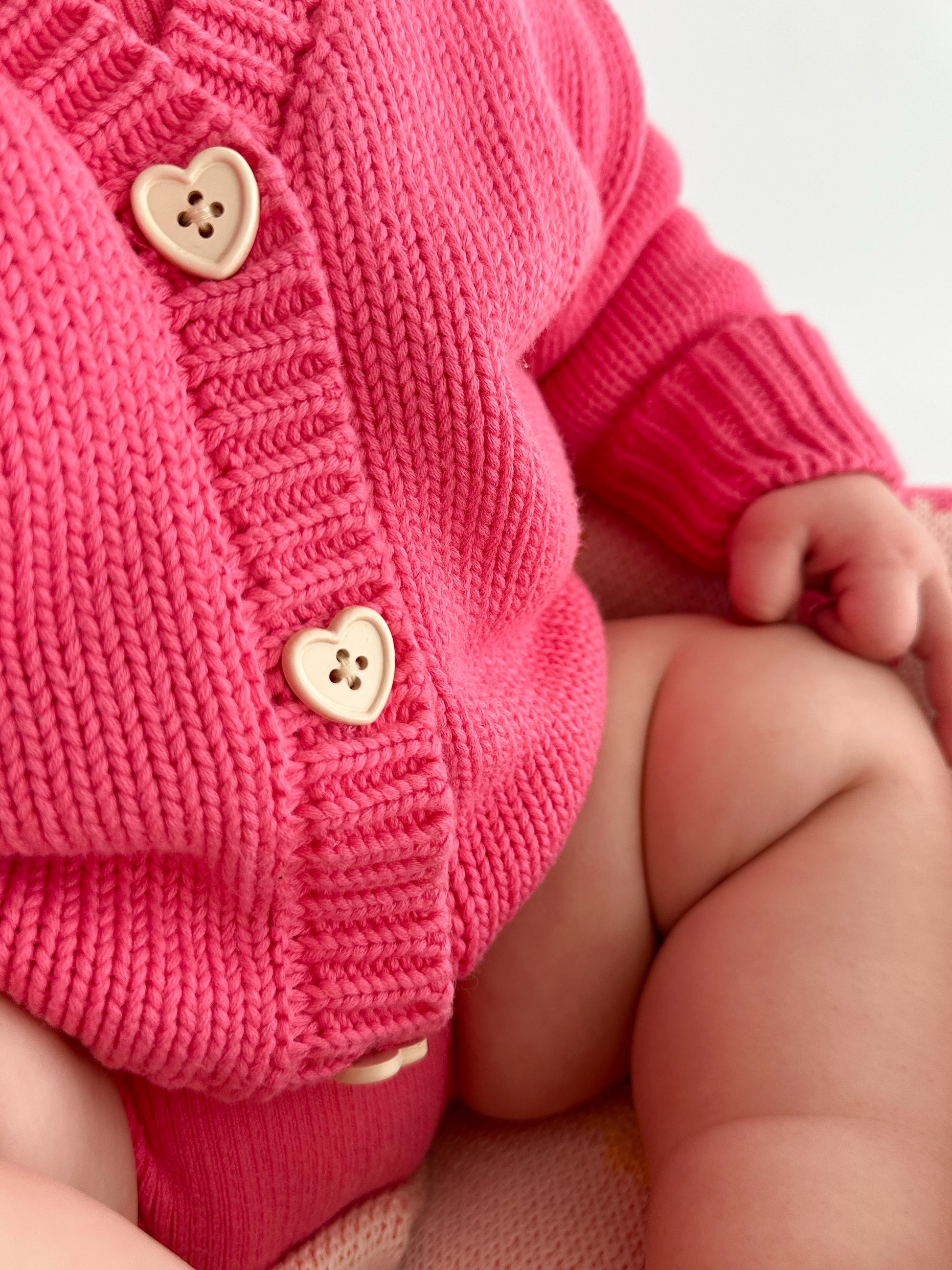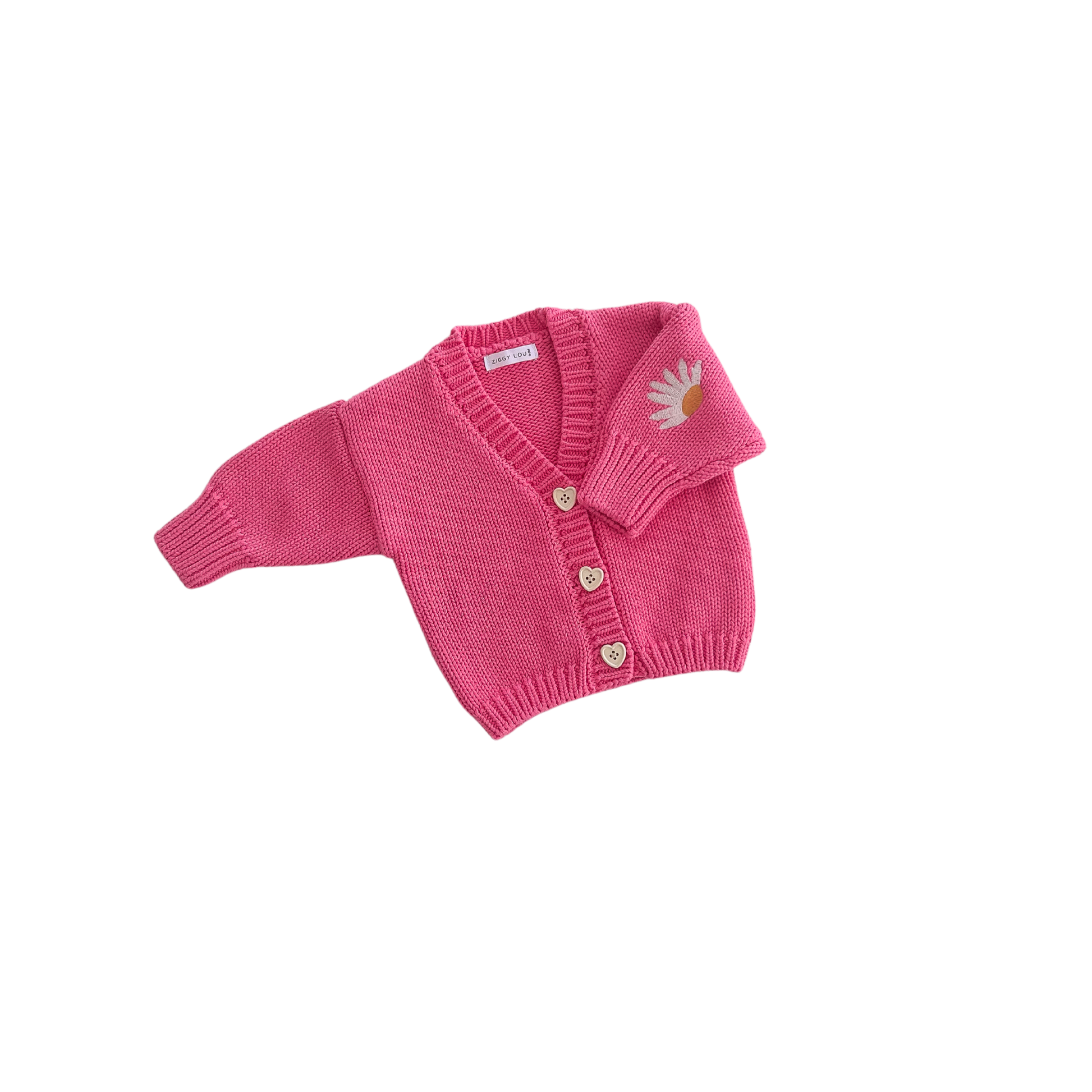 Knit cardigan featuring embroidered elbow flower detail and functional love heart buttons. Mix and match with items from our Marlow + Raspberry Collections.