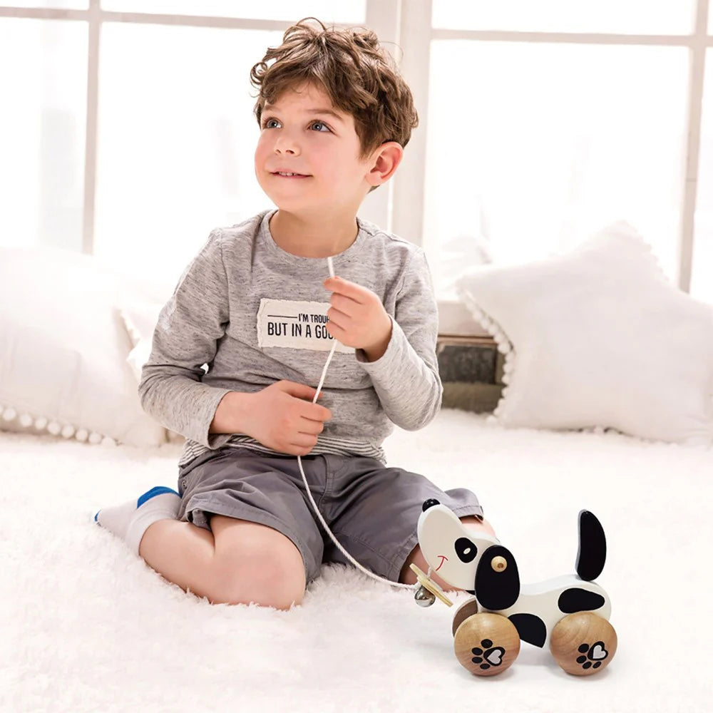 The tail wags and the bell jingles as the dog rolls along, creating delightful movement and sound to encourage walking and coordination. The four paw-printed wheels ensure smooth motion on any surface, helping toddlers build confidence as they pull their puppy through playtime adventures.