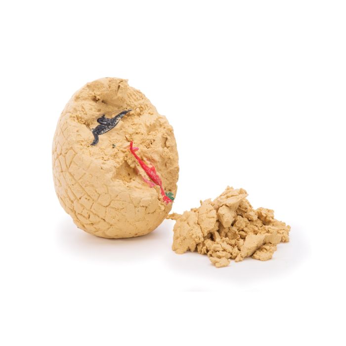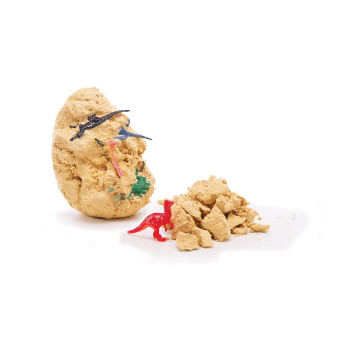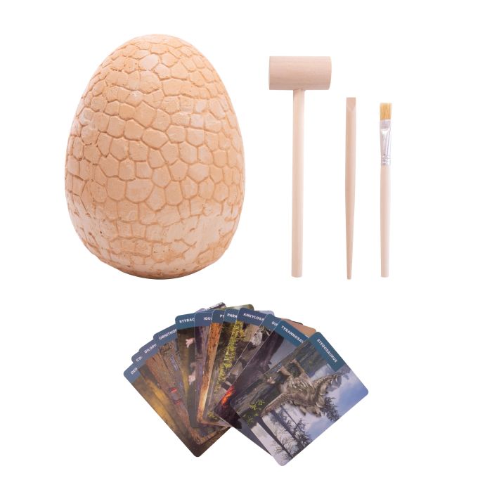 Use the wooden mallet, chisel and dust brush included to chip away at the egg, to reveal 14 mini dinosaurs, including a :-