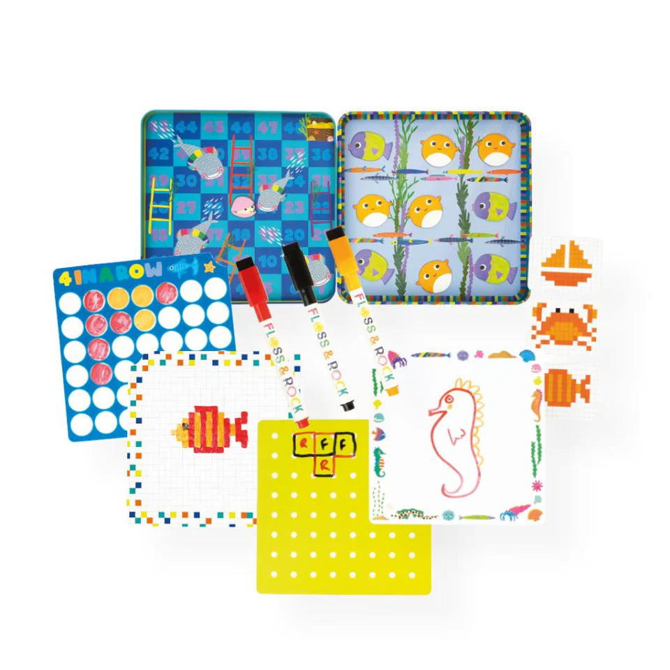 Make a splash with Magnetic Fun & Games Ocean by Floss & Rock—an all-in-one portable playset that brings the wonders of the sea to life! Featuring colourful marine illustrations of whales, jellyfish, submarines, and more, this compact activity case includes four engaging games: magnetic scenes, classic games, puzzles, and a dry-wipe doodle board. Whether at home, in the car, or out to lunch, it’s the perfect solution for mess-free, screen-free fun. Designed with recycled materials and vegetable inks, this ocean-themed set combines playtime with planet-friendly values.