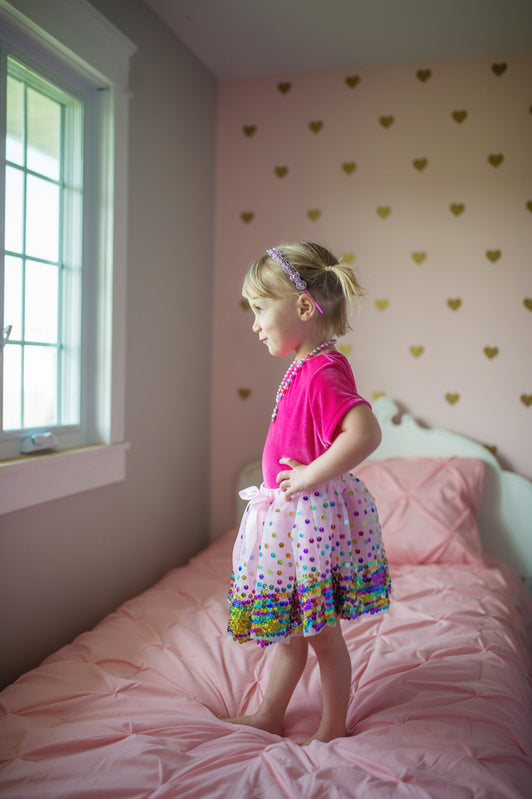Perfect for days of celebration or for dancing around the house. This soft pink skirt is covered in rows of rainbow sequins and finished with a satin bow at the waist.