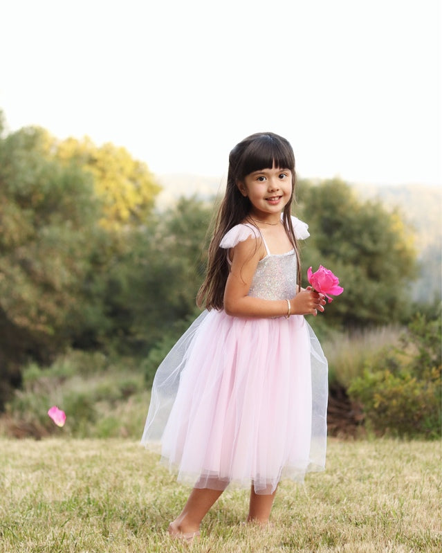 A stunning pink princess dress that sparkles and shines. With 2 layers of soft pink tulle and a layer of iridescent glitter tulle, the skirt will always be fluffy and bright. The sequin top is made from iridescent sequins with a soft stretch spandex lining. The straps are made with stretch spandex and feature tulle puffs. A small satin bow detail finishes this adorable princess dress with a touch of class.