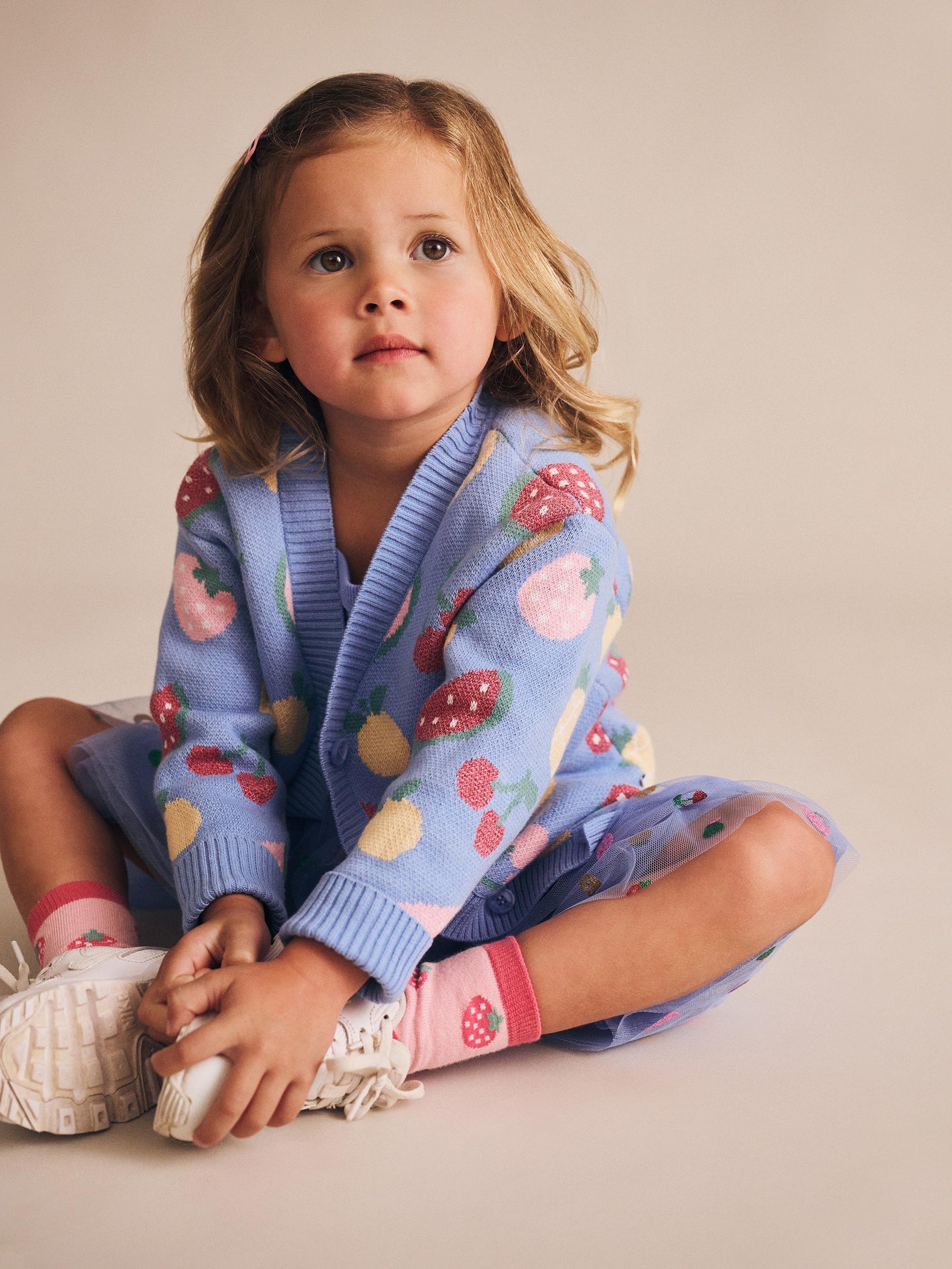 Three pairs of the softest, squishiest ankle socks you’ll ever meet. Made with a breathable blend of fibres to cushion busy feet. These pretty and colourful socks feature our custom tutti frutti and strawberry patterns. Made with non-slip grippies on baby sizes 6-12 months.