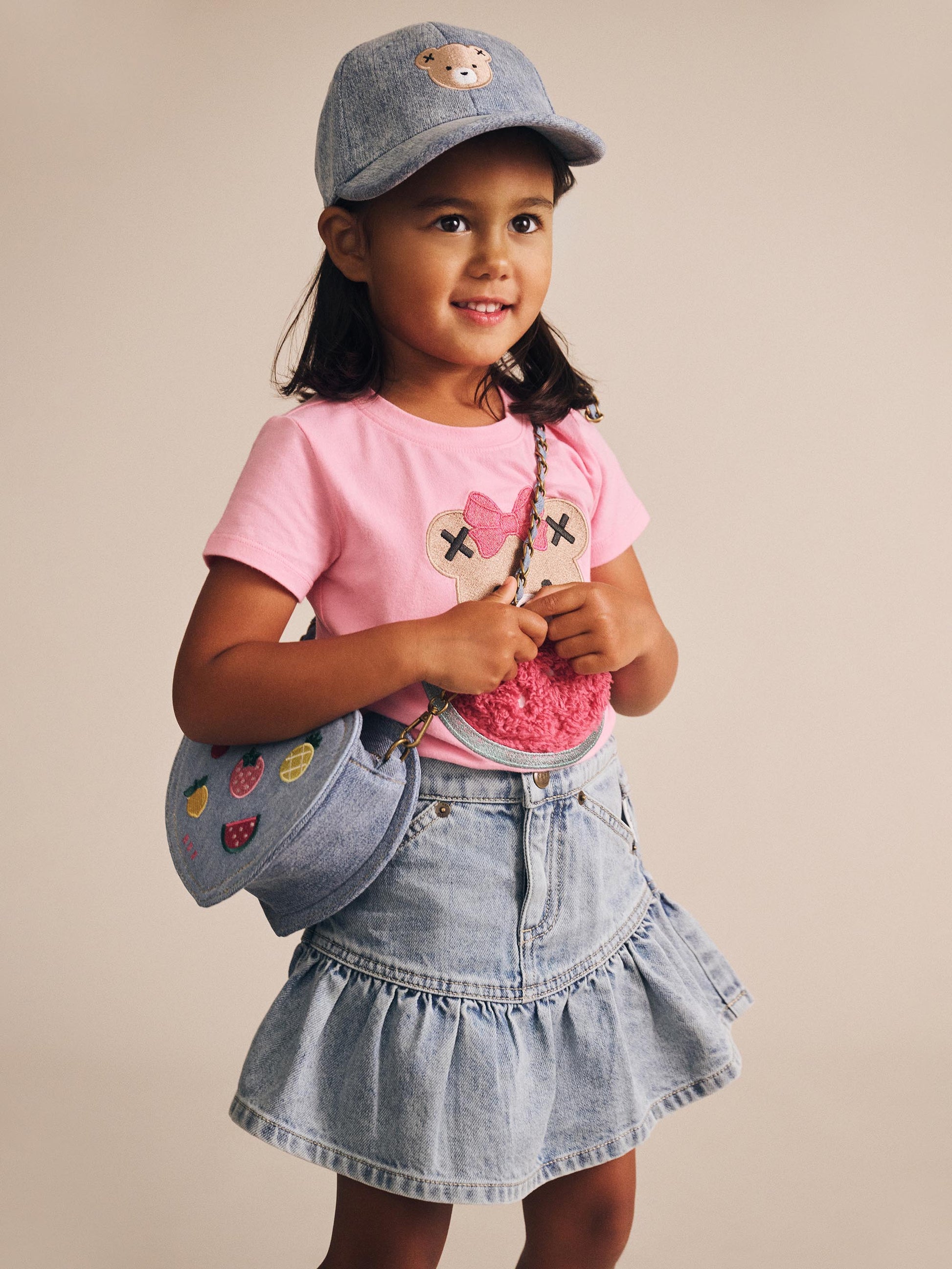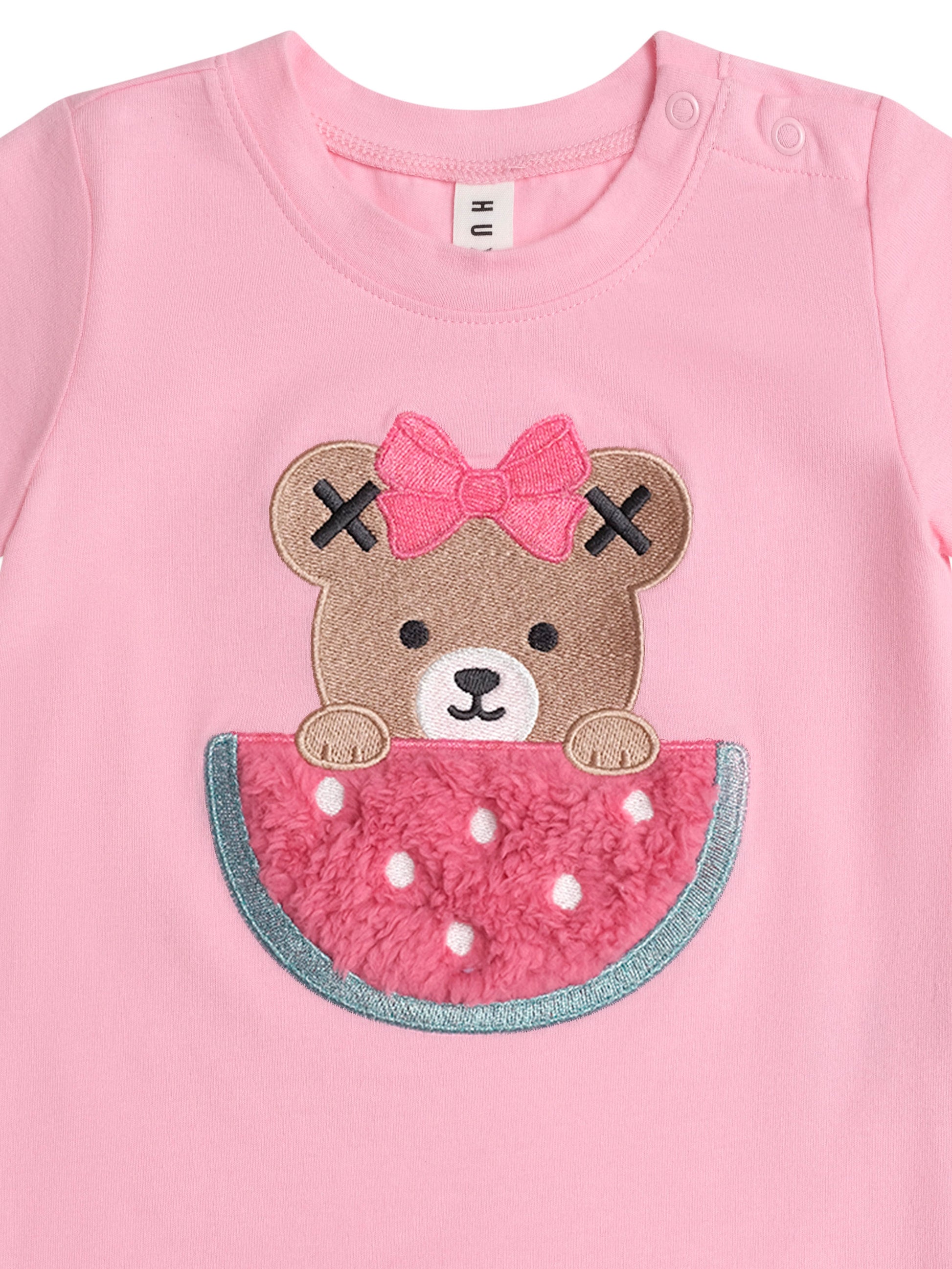 The perfect everyday tee, but with added sparkle. This round neck t-shirt is made from buttery-soft organic cotton in pretty pink and features a sparkly watermelon bear embroidery. Baby sizes feature stainless steel shoulder snaps for quick changes.