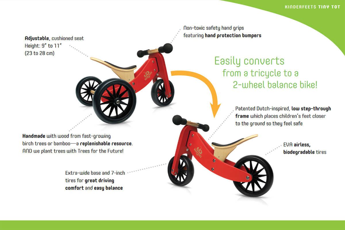 Patented, award winning 2-in-1 balance bike and trike. One year olds can start with the Tiny Tot as a trike. With three wheels they can easily start to learn how to use their feet to get moving. When the parent feels the kid is ready, the Tiny Tot easily converts from a trike to a 2-wheel balance bike. Tiny Tot Trikes are the smallest 2-in-1 balance bike on the market.