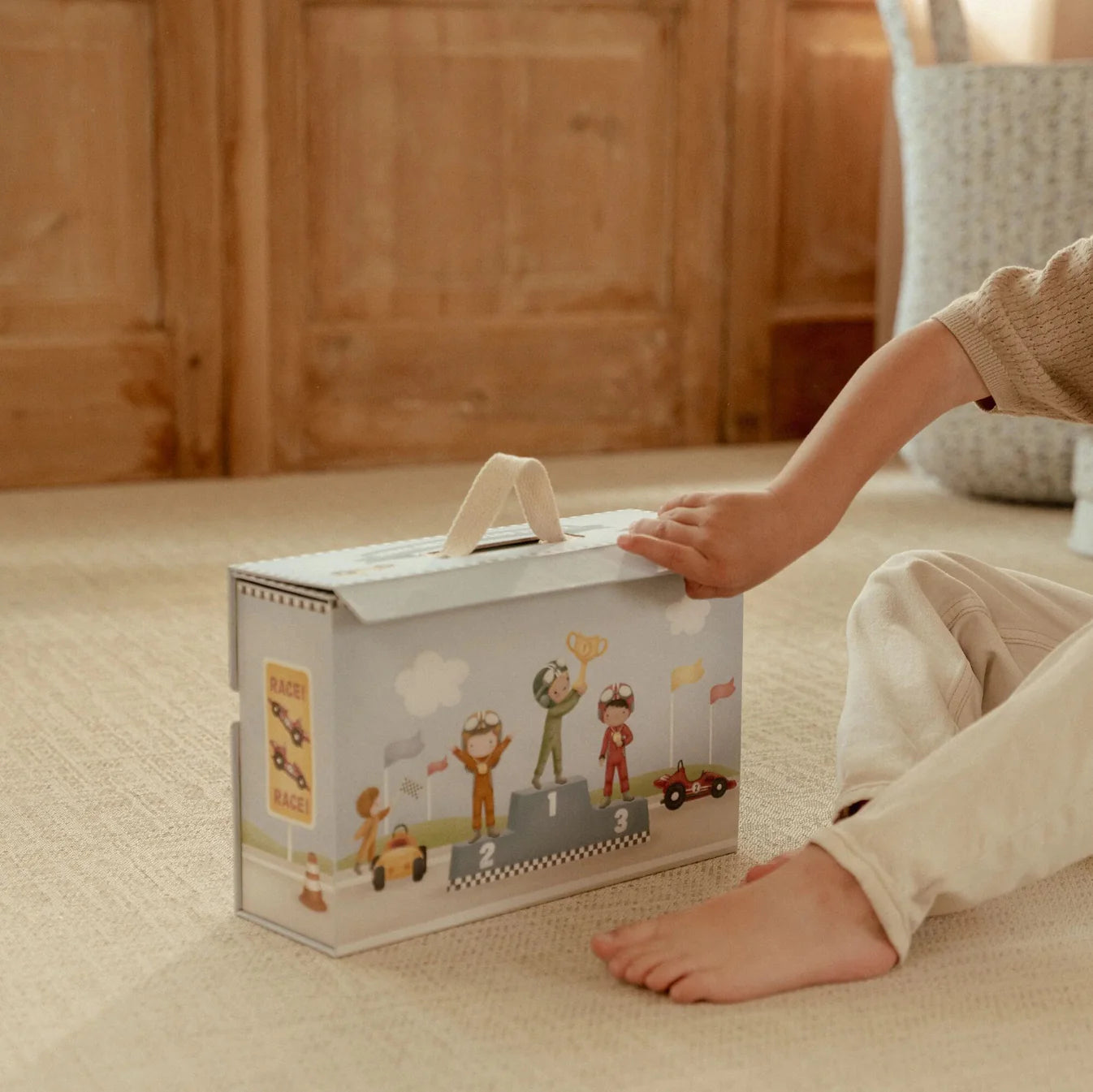 Start your engines! This cardboard play case transforms into a complete racetrack. The set includes everything you need for an exciting race: race cars, drivers, a finish line, traffic signs, a trophy, and a winners’ podium. The cardboard racetrack consists of separate pieces that can easily be assembled like a puzzle. After the race, you can store everything neatly in the case. Ready for the next race?