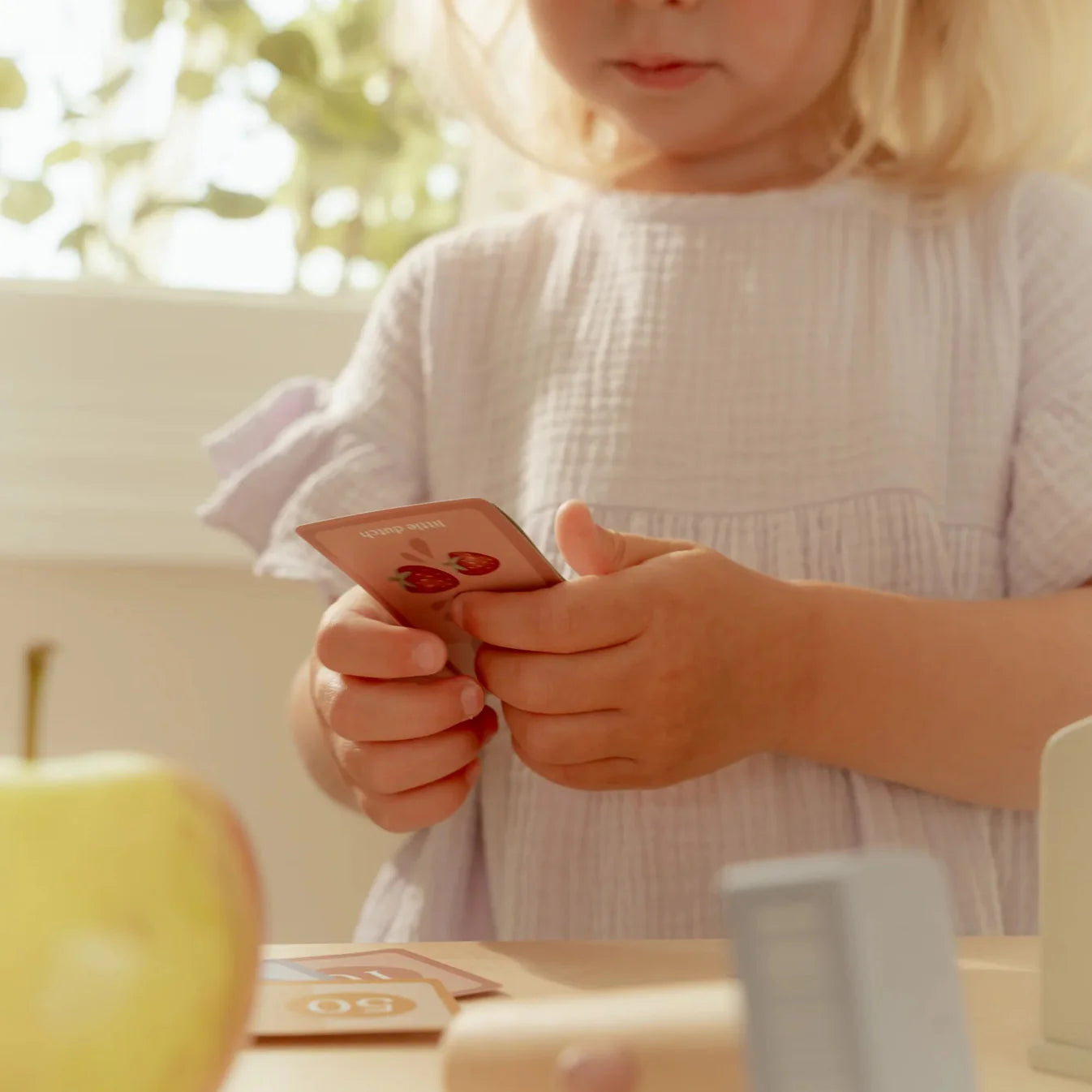 Calculate, scan, and pay up! With this wooden cash register, playing shop feels even more real. The register is equipped with a scanner, card reader, buttons, and a cash drawer for coins and bills. It also comes with a bank card, so customers can pay with cash or card. A fantastic way to playfully learn about money and numbers. What will you buy today?