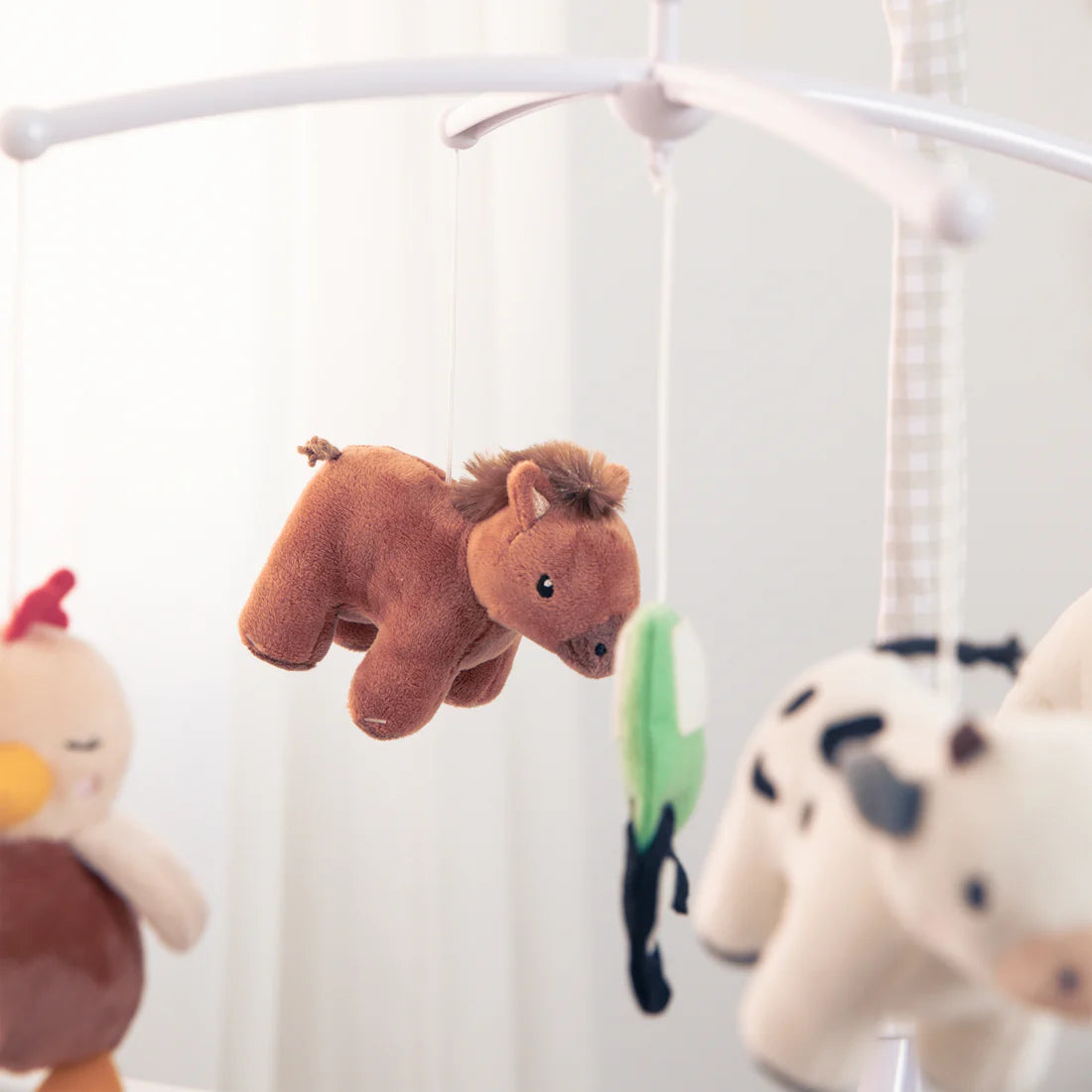 Little ones are going to love watching this farm scene gently rotate overhead to Brahms lullaby as they drift off to sleep. This gorgeous musical cot mobile features exquisite detailing and is the perfect finishing touch to your nursery.