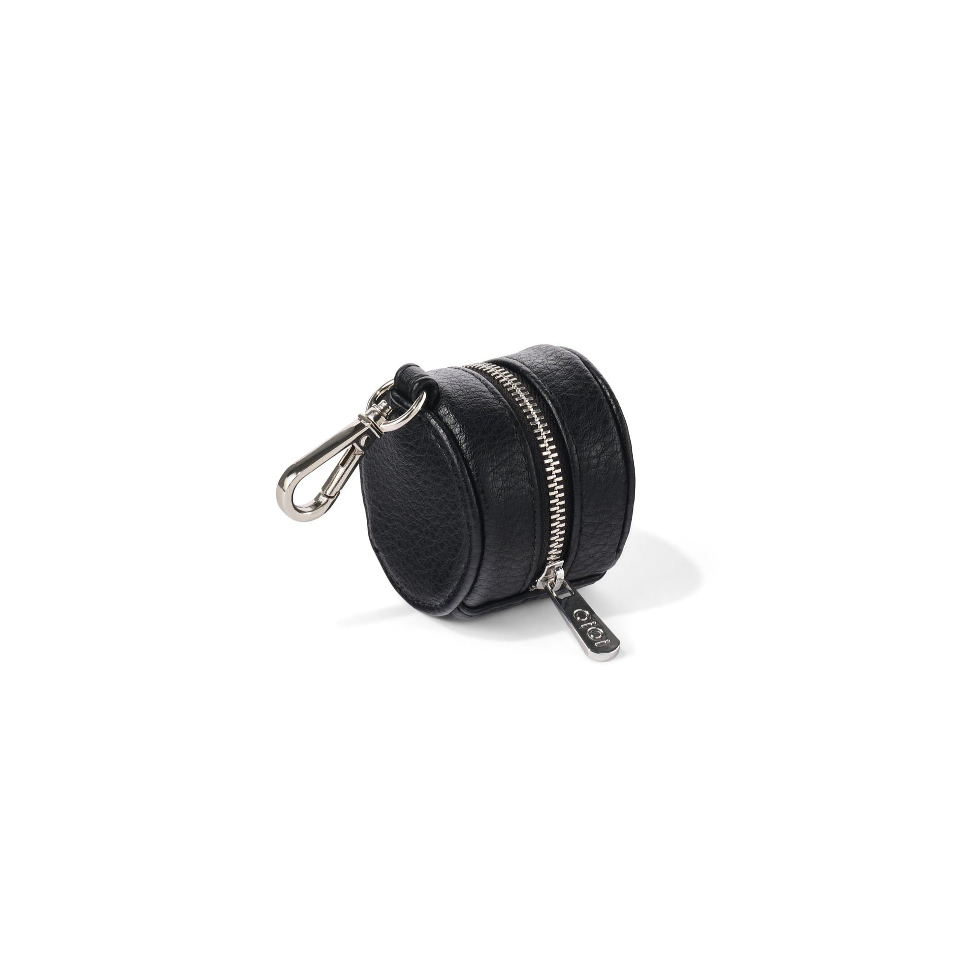 Crafted from premium black dimple vegan leather, this stylish and functional accessory features a convenient clip, allowing you to easily attach it to your bag.