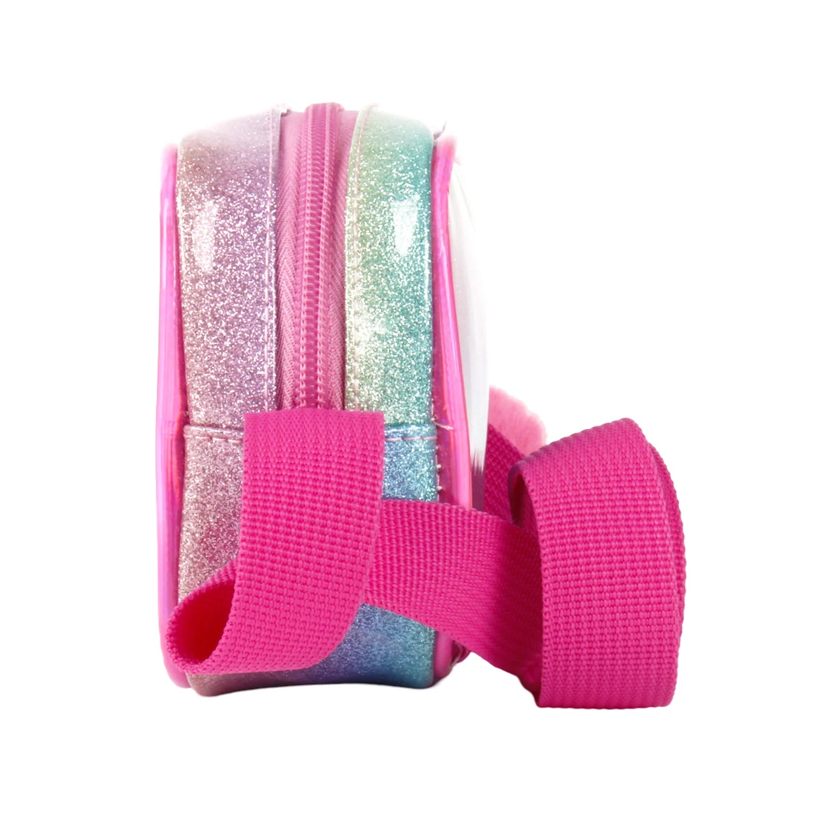 Adding a pop of fun, a fluffy bright pink pom pom charm dangles playfully, perfectly complementing the vibrant pink shoulder strap and zipper pull. Designed for both style and practicality, the adjustable strap ensures a comfortable fit, while the secure zipper keeps little treasures safe.
