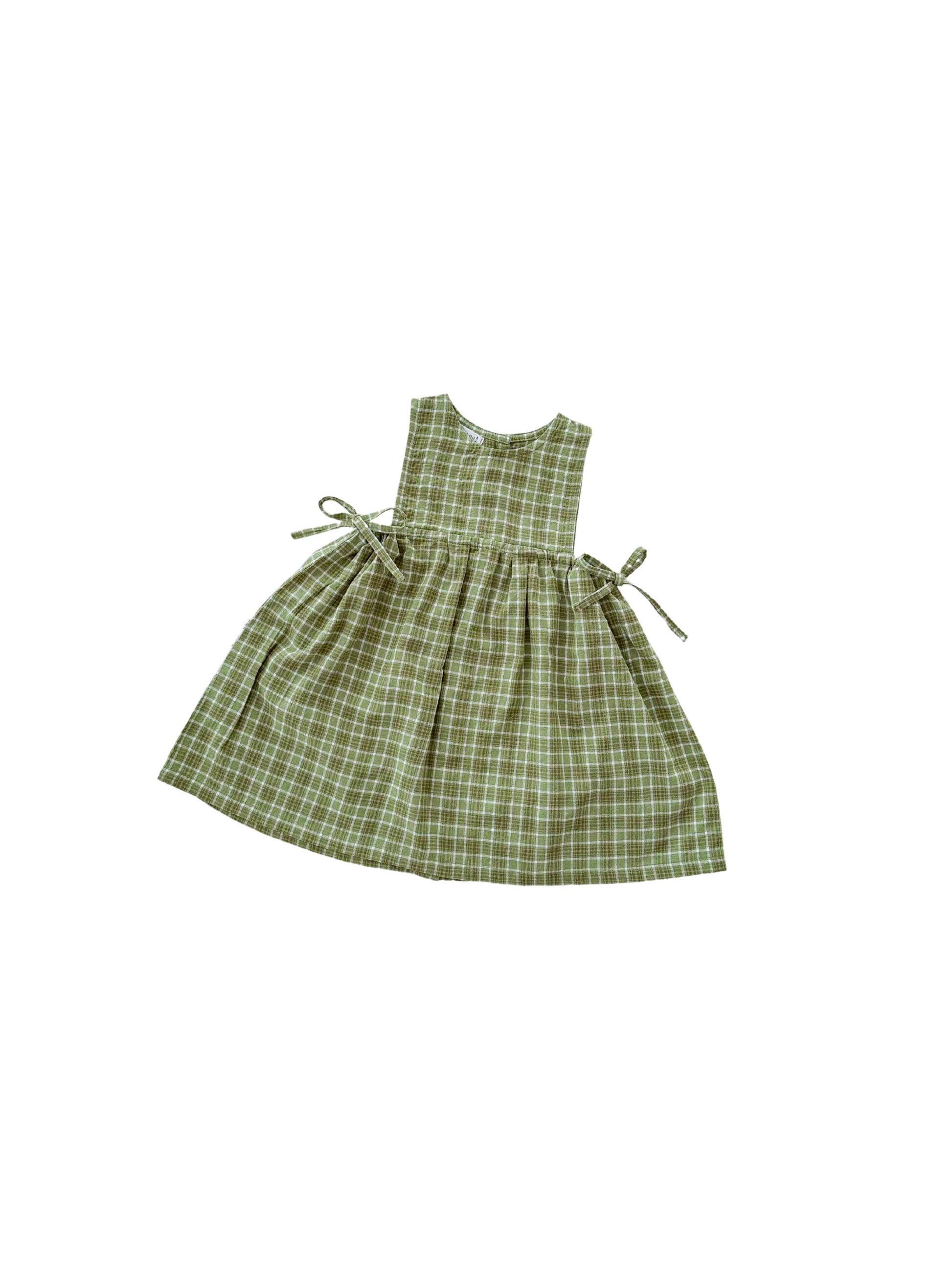 Cotton dress in our beautiful Thyme fabric. Adjustable ties at waist and buttons on the back for easy on/off. Mix and match with items from our Christmas Collection.